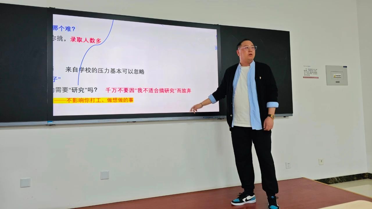2021级行政管理班的班主任。“考研动员会”对于这个班的同学们来说,不是一件新鲜事。从2021年9月入学开始,几乎每个寒暑假的一前一后,曲老师都会召开班会,而历次班会职业规划、学业指导的常规曲目中一以贯之的重头戏,就是“考研动员”。
