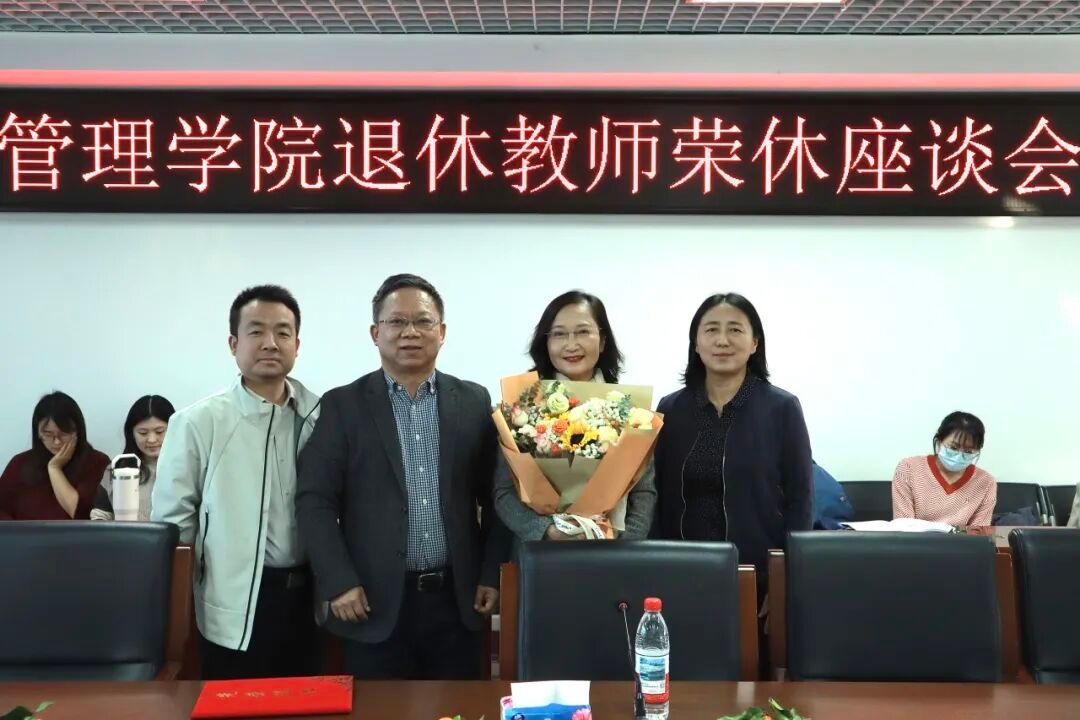 为张瑛、吴雅杰、王丽平、张红梅四位教师举办荣休仪式,学院党委书记闫建敏、院长黄锐及学院教师代表参与会议。